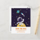 Spara datum-kort med en mörkblå bakgrund med gula stjärnor utspridda runt omkring. Ovanpå ligger en illustration av en rymdman som bär en vit astronautdräkt svävande ovanför månen. Vinkar hej när han utforskar rymden. I fjärran syns en planet med ringar och ett rymdskepp som flyger iväg i rymden.