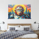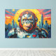 Detta livfulla konstverk av Otis Porritt presenterar en slående orangutang, prydd med snygga hörlurar och futuristisk, segmenterad rustning. Dess intensiva rödaktiga ögon och detaljerade skägg fångar uppmärksamheten, renderade med en dynamisk, impasto-liknande teknik som skapar rika texturer. Bakom den centrala figuren vecklar sig ett fantastiskt stadsscape under en virvlande, mångfärgad himmel, där avlägsna arkitektoniska former reser sig mitt i en kosmisk bakgrund med flera månar. Paletten exploderar med mättade blå, eldröda orange och djupa röda toner, som bidrar till konstverkets energiska och surrealistiska atmosfär.