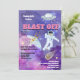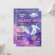 Om du är värd för en rymdtema-födelsedagsfest för din dotter är denna illustration av en söt, tecknad grön utomjording som flyger ett UFO-rymdskepp genom en blå, rosa och lila stjärn- och planetfylld galax med meteoriter den perfekta designen för din fest. Mallarna kan anpassas efter dina krav och födelsedagsflickans ålder kan läggas till på baksidan av inbjudan. Denna design är också idealisk för barnkalas med aliens och galax-tema.