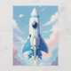Ett elegant rymdskepp glider effortless genom den azurblå vidden av den blå himlen, dess blå och vita design fångar solljuset med varje graciös manöver. Mot den lugna bakgrunden sticker farkostens avancerade design ut och skapar en slående kontrast mot den ändlösa horisonten.