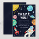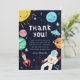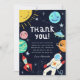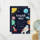 Söt tack-kort för ett barns rymdtema födelsedagsfest med illustration av en galax i krita, inklusive en astronaut, UFO, planeter, stjärnor, raket. Meddelandet tackar vännerna för att de kom och hoppas att de hade en jättekul. Anpassa denna produkt genom att lägga till barnets namn längst ner.
