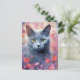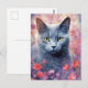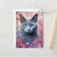 Färgrik akvarell konstverk av en rysk blå katt som sitter i en åker med vårblommor.