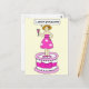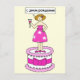 En tecknad dam stod på en gigantisk kaka och sa Grattis på födelsedagen på ryska. Dam har en cocktail i ena handen och bilden ställs mot en bakgrund av citronfärgaden.