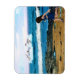 En digital målning av en ung flicka som springer längs kusten och som ska se delfinerna spela ut till havs.