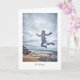 Ett hälsningkort som presenterar en kvinnabanhoppning för glädje av något, vaggar på en strand. Hon ärmar och ben outstretcheds delvist, roterande det in i ett krabbahopp. Hon ha på sig en vadderad jacka mot kallet, och hon hår lyfter i vinden. Med ett breda lyckligt uttryck och ögon, är det total- intrycket av vildöverdåd.