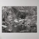 Svartvitt fotografi av den sceniska vintern bäck/dammområdet Sabino Canyon i Tucson, AZ