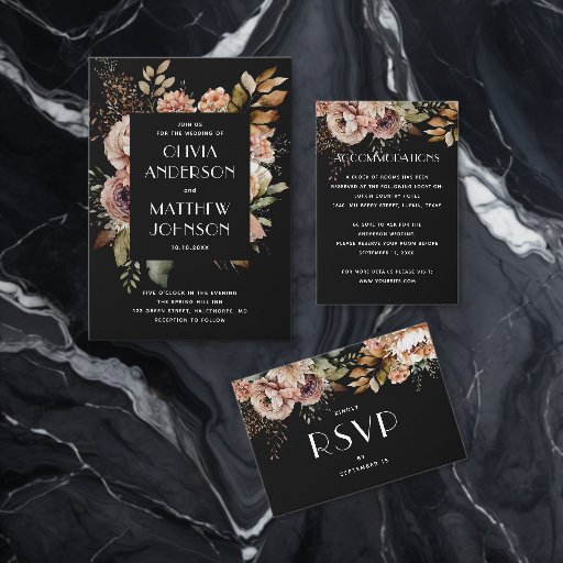 Säckdiagram för svart fallande boho blommigt bröll inbjudningar