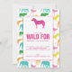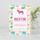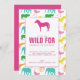 Vi går vild med roligten födelsedagsfest inbjudan. I mönster finns sex olika djur som påträffas på en safari, var och en i sitt eget färg. En zebra silhouette visas längst upp på inbjudan. Köp hela den samordnande insamlingen för alla dina behov av safari party.