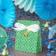 Den här partikellådan har en upprepande mönster av gröntens djungelns löv över en ljusare gröntens bakgrund och klippet om en söt baby brun och orange giraffe på framsidan. Hitta samordning av födelsedagsfester i Baby Safari Animals Party-insamlingsklipperteckningen med PretypeGrafik design etsy.com/shop/Prettygrafikdesign