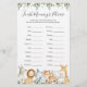 Safari-djuren "Bebisdusch" avslutar mamma-spelkortet med en vattenfärgsbild av safari-djur och vattenfärgsgrey eucalyptus garland och elegant handskrivet stil-typsnitt.