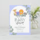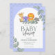 Safari Animals Boy Blue Baby Shower-inbjudan. Vattenfärg Botaniskt grönland med djungeldjur, inklusive giraff, elefant, lejon och rino. Cute small elephants mönster på en blå bakgrund på baksidan av kortet.
