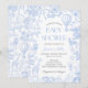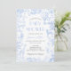 Elegant Blue Toile de Jouy Blommigt Baby Shower-inbjudan, med ett charming safari-djurtema. Den här vackert designade inbjudan visar en luftballong tillsammans med adaterande safari-djur som en giraffe, elefant, zebra och lejont, alla mot en blå blommigt chinoiseribakgrund. Med sin vintage estetisk och strålande typografi anger inbjudan tonen för ett tidlöst firande. Fullständigt anpassade för att matcha din händelseinformation, det är perfektens val för en pojkes safari-temade babydusch, blandningscharm och sofistikering.