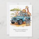 En vattenfärgsklippare som illustrerar en munkfull himmel blå Jeep parkerad på en sanddyna. Jeepet har ett vitt tak-rack med tre vita safari-djur - en leende giraffe, en nyfiken zebra och en lekfull lejon - överst. Bakgrunden är att sanddyner rullas under ett ljust, ljust himmel med fluffy white moln och avlägset handflatan träd. Sämre skuggor som kastas över scenen och skapar en lätt och äventyrlig känsla.