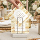 En söt saga-inspirerad safari-design med mjuka akvarell-bebisar som lejon, giraffer och elefanter omgivna av mjuk djungelgrönska och ömtåliga botaniska detaljer. Den varma neutrala färgpaletten med kräm, honungsguld och mjuk oliv skapar en tidlös naturinspirerad estetik, medan den eleganta välvda layouten lämnar vacker plats för personliga evenemangsuppgifter.