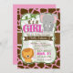 Det är en tjej! Cute flicka elefant och lejon, djungel, safari, zoo-animerad babydusch på pastellernas rosa och brunt giraffe skriver ut mönster med grönt vinrankor, löv. Underbar för djungel, zoo djur eller safari, matade babyduschar. inbjudan med vintage inom parentes. Färg omfattar pastellernas rosa, brun, grönt, grått och vit.