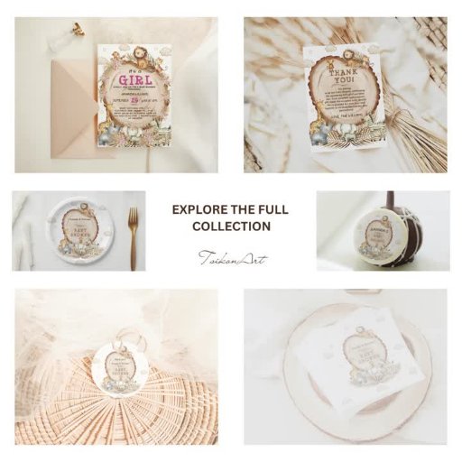 Den här unika inbjudan till babyduschen innehåller en blandning av rustiska accenter i vintage i varma tonar som beige, fawn och brunna. Odjungeldjur, inklusive en lejon, apa, tiger, zebra, rino, elefant och giraffe, ger en lekfull beröring. Elegant pampasgräs och handflatan löv kompletterar träets bakgrund, skapar en mysigt och inbjudande atmosfär.