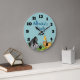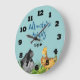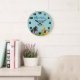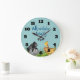 Rundklocka med ett safari-tema. En vattenfärgad illustration med en gorilla, hippo, lejon och giraffe som hänger ut bland de grönt gräsmassorna. Typografin säger att Äventyr väntar. Cute och vismisk perfekt för ett barn.