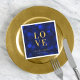 Elegant servett med orden "Love" i falskt guldfolie mot en bakgrund med sapphireblå bokeh-ljus. Perfekt för förlovningsfester, bröllop och årsdagar.