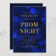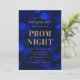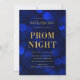 Elegant inbjudan till studentbal med orden "Prom Night" i falskt guldblad på en bakgrund med sapphireblå bokeh-ljus. Inbjudan har en blå bakgrund på baksidan.