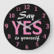 Tittar du en söt motiveringsväggklocka för någon du kärlek? Vad sägs om den här coolan runt formad väggklocka som säger "Säg ja till dig själv" tryckt i rosa och vitt brev mot svart bakgrund i färg? Oavsett när det är dags, är det alltid dags att säga JA till er själv!