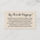 Om du är värd för en barndusch i gender-neutralt, utan gåvopappning i visningen för den nya mamman som ska visas, kan du välja det här enkla kortet. Med hjälp av ett söt, modernt typsnitt, lade jag först till ett huvud som på ett milt fräckt sätt tillkännager avsikten: "Säg nej till Wrapping!" på framsidan och "to" och "from" på presentsidan. Mallen fält har upprättats för att ge gästerna instruktioner om att inte fylla i sin present. Var vänlig och ändra ordalydelsen på det sätt du vill. Alla typsnitt och färg kan ändras efter behov.