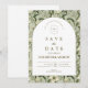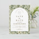 A sophisticated botanical design featuring rich green foliage and soft ivory blooms, framed within a timeless arched layout. The deep, nature-inspired tones bring a sense of depth and refinement, while the clean typography keeps the overall look elevated and effortless.
