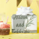 Parets namn och bröllop dejtar på en sederbakgrund med eukalyptus sprigs.