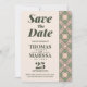 Announce your big day with this stylish Art Deco-inspired Save the Date card. Featuring a sophisticated geometric pattern in sage green and dusty rose, this design offers a perfect blend of vintage elegance and modern functionality. The vertical layout includes a decorative side border and a convenient QR code for your wedding website. The reverse side features a full-patterned back with a personalized monogram. A beautiful way to ensure your guests mark their calendars with style.
