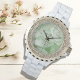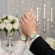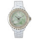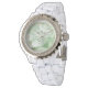 This elegant bridal timepiece features a soft sage green watercolor dial accented with warm gold details, framed by a sparkling crystal bezel and finished with a glossy white enamel bracelet. The refined color palette evokes purity, romance, and understated luxury—perfect for weddings, nikah ceremonies, and meaningful bridal gifting.
