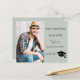 On front: Add your own vertical size photo of the graduate. A trendy muted sage green colored background, black text. Templates for a name and date. The name is written with a modern hand lettered style script. With a cap, tassel topper.