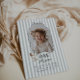 Celebrate your little one's Goose themed first Birthday with this easy to edit template. Featuring a playful wavy bow border with your own custom photo inside. There is a sweet little goose with a green bow on it in the corner, along with 'One silly goose' typography, along with a sage green stripy background.