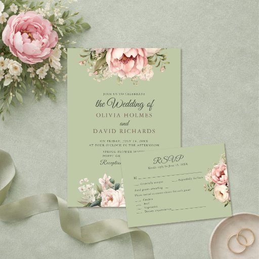 Sage Green Peony Floral Wedding Details Card Inbjudningar