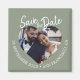 Sage green photo modern script save the date magnet featuring a heart-shaped photo window, muted sage green background, and hand-lettered script text in white. This design highlights your engagement photo while clearly sharing the wedding date and location in a calm, organic color palette that feels both modern and timeless. Ideal for weddings, outdoor celebrations, destination events, or vow renewals with a natural, refined aesthetic. Easily personalize with your details.