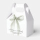 Elegant bridal shower favor gift boxes featuring a sage green bow watercolor, "with love and thanks" showcased in a chic calligraphy script, and the name of the bride and her shower date in simple lettering.