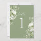 Soft sage green tones paired with organic greenery watercolor florals create an elegant and calming table number design for modern garden weddings.