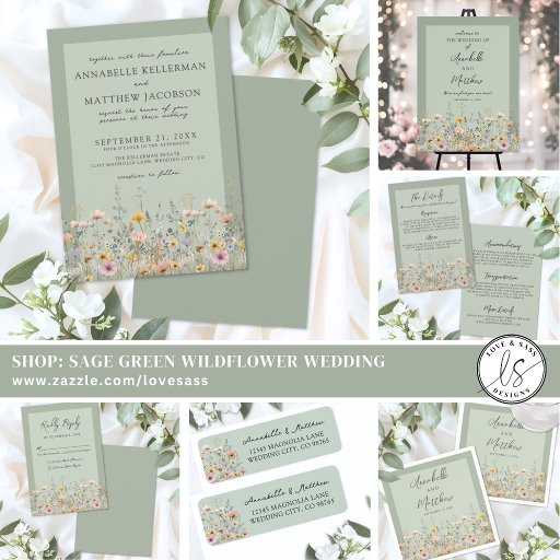 Bring a touch of nature’s elegance to your wedding with this refined invitation design, featuring soft shades of sage green across the front for a calm, organic look. Delicate wildflowers form a graceful border, showcasing muted pink, yellow, lavender, and blue blooms paired with gentle green leaves and stems for a fresh, garden-inspired feel.