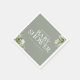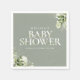 En elegant babyduschnapkin med modern typografi och söt botaniskt grönt löv på en könsneutral grönt bakgrund. Designad av Thisisnotme©