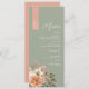 Lägg till mjuk, rustik charm till din mottagning med den här menyn för grönt bröllop för personlig som innehåller varje gästs namn i ett lodrät-persikoband. Elegant-skript typsnitt och ett lugnande bakgrundspar av grönt med den romantiska , persikofärgade och elfenbensfärgade blommigten vid grund, kompletterat med torkad löv för en subtil fallkontakt. Idealisk för boho, rustik eller bröllop på landsbygden dubblor den här menyn som ett platskort för snyggten och keepsaké. Anpassa enkelt gästen namn och middagen kurser till din speciella dag.