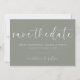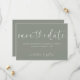 Lägg märke till din speciella dag med underskattad elegans med hjälp av det här grönt bröllop spara datum-kortet. Med modern typografi och en mjuk, minimalistisk utformning är den här utformningen perfekt för par att planera ett romantiskt, elegant eller naturinspirerat bröllop. Anpassa namn, datum och formulering så att de stämmer överens med bröllop stil. Idealisk för vår, sommar- eller trädgårdsbröllop sparar det här datumet perfekt med matchande inbjudningar och gröntar för sage-. Enkel, snyggt och tidslängd - precis som din kärlek-artikel.