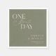 Den minimalistiska bröllop-repetitionsmiddagen välkomnar napkin med typografi som säger "en dag till". Bakgrunden är sage grönt.