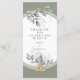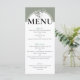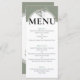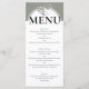 Grymt modern bröllop-meny i sage grönt och vit med eukalyptus löv (fram och bak). Lätt att uppdatera - den ena sidan innehåller dina matalternativ, den andra ett personligt budskap och namnen. Helt underbar design med bröllop ringar som visar på designen med namn.