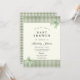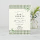 Fira en liten annons med den här charmerande babyduschinbjudan, som innehåller en enkel grönt gingham gräns och back, elegant, svart manus typsnitt och en söt vattenfärgsböna. Perfekten för firande mellan land och stil är denna inbjudan både varm och snyggt. Anpassa texten för din händelseinformation och skapa ett inbjudan som gästerna ska ta hand om.