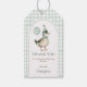 Välgörliga anka-temade favorittaggar med en härlig illustration av ett charmigt anka i en bukhinna och party hatt, framtagna med en mjuk pastellform grönt gingham gräns för ett vismiskt och rustiskt utseende. Anpassa ordalydelsen till kostym i tillfälle, dvs. födelsedag, babydusch, sprinkle i baby, baptism osv.