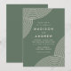 Moderna bröllopsinbjudningar med krämsnat geometriskt linjer i hörnen med gröntens bakgrund. Anpassa terracotta-bröllopsinbjudningarna genom att lägga till dina uppgifter om namn och bröllop. Den moderna boho-bröllopsinbjudan går tillbaka till visningen med en solid sage grönt bakgrund.
