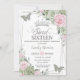 Den här chicen Sweet 16 Birthday-inbjudan innehåller ett silver glitter-geometriskt ram som är märkt med delikat grönt för vattenfärgsfärgning, blommigt för rosa av blek, mjuk sage grey och sage och silver fjärilar. Anpassa den enkelt och snabbt med dina detaljer genom att helt enkelt trycka på anpassningsknappen för att ytterligare ordna om och formatera stil och placera texten. c) Lycklig Cat Studio