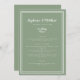Enkel, minimalistisk och elegant bröllop-meny har en contemporary med dubbla ram, vit gräns i på en rustik grönt bakgrund. Traditionell ordalydelse ger en tidlös men ändå modern sofistikering. Anpassa designen i bröllop med menyinformationen i vitskrift och skript. Kortets baksida matchar i fast matchande grönt.