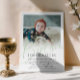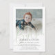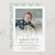Minimalistisk baptisminbjudan in med baptism skriven i ett penselskript för grönt av blek. Lägg till namn och text i mjukt grått. Anpassa med ett foto av baby. Baksidan har en grönt och ett vitt mönster med kor.