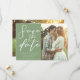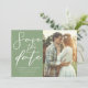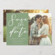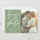 Den här enkla grönten för helsidesbild Ett foto Spara datumkortet innehåller ett vitt skript för eleganten för en utlandsceremoni i en naturinställning. Minimalistisk typografi på fredliga fotografiinbjudningar till ljust grönt förlovningar för en plats utanför träd nära en skog.