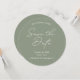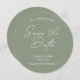 Meddela din speciella dag med vårt "Sage Grönt Minimal Bröllop spara datum Round Card". Det här kortet har en elegant och modern grönt i elegantens sage och har en sofistikerad ton för bröllop. Anpassa med namn, bröllop-datum, QR-kod, bröllop-webbplatser och information så att det blir unikt för dig. Perfekt för par som vill ha ett minimalistiskt och snyggt spara datum meddelande.