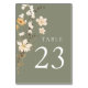 Sage Grönt Wildblomme Bröllop Bordsnummer Card har en mjuk, elegant stil med en muterad bakgrund av grönten som känner sig lugn och tidlös. Fintvätt av vit blommigt längs den lämnat sidan ger en liten aning stollig och naturinspirerad charm. Utformningen är ren och välorganiserad. På det hela taget känns utformningen romantisk men underskattad, perfekt för ett modernt men traditionellt bröllop. Se Matchande bröllopsinbjudan.
